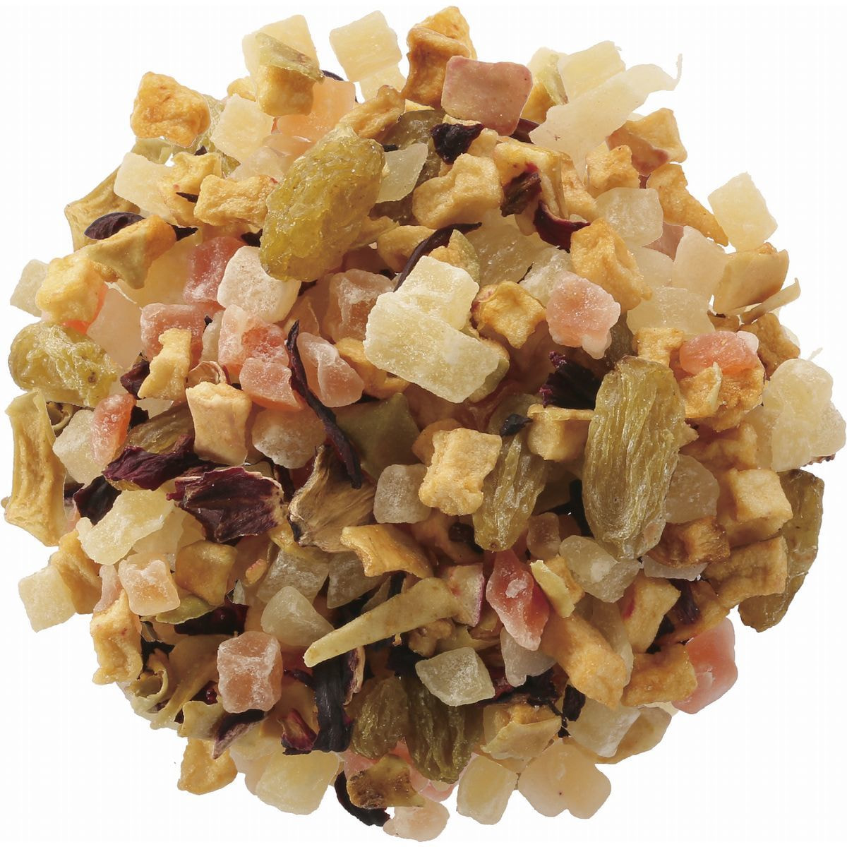 加糖ドライパイナップル(タイ製造)、加糖ドライパパイヤ、有機ドライアップル、有機ハイビスカス/香料、クエン酸、保存料(亜硫酸塩)