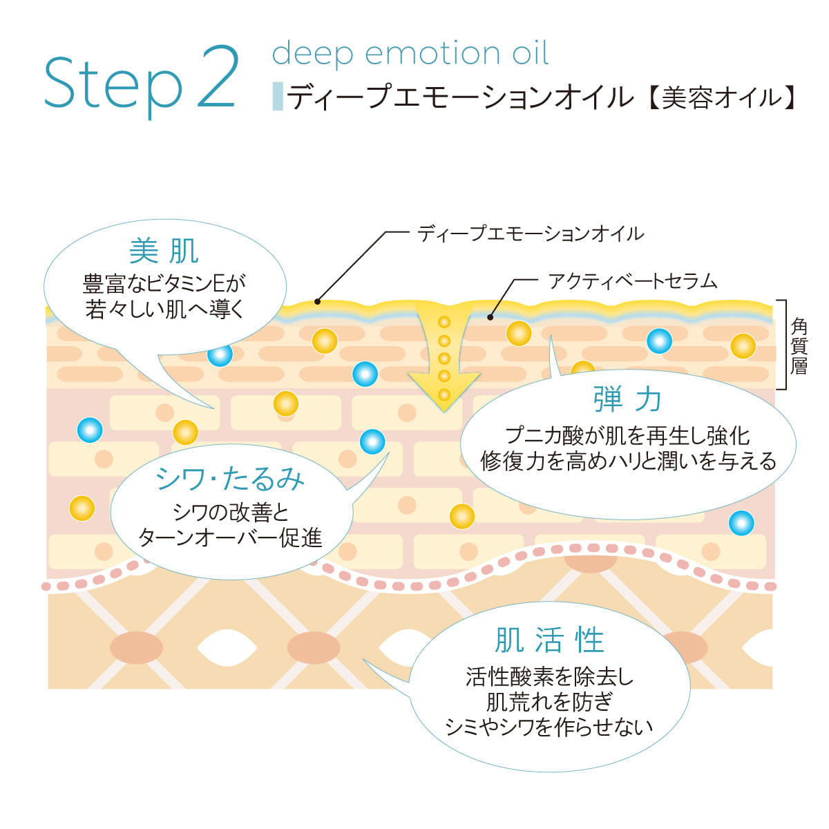 Step1アクティベートセラム→Step2 ディープエモーションオイル→Step3SPブーストエフェクト