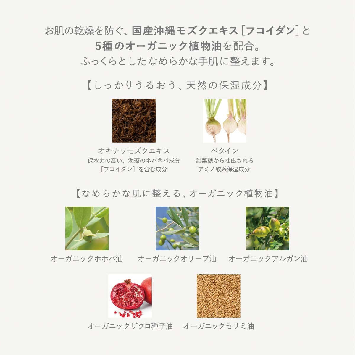 水、プロパンジオール、ホホバ種子油*、オリーブ果実油*、スクワラン、ヒマワリ種子油、水添ナタネ油アルコール、ステアリン酸、ペンチレングリコール、ベヘニルアルコール、パルミチン酸セチル、ベタイン、カプロイルプロリンNa、アルガニアスピノサ核油*ザクロ種子油*ゴマ油*グリチルリチン酸2K、オキナワモズクエキス、ミツロウ、ステアリン酸スクロース、ジステアリン酸スクロース、ミリスチン酸ポリグリセリル-10、キサンタンガム、トコフェロール、ヒノキ油、カナリヤノキ樹脂油、ボスウェリアネグレクタ樹脂油、ラベンダー花油、ビャクダン油、ベチベル根油、パチョリ油、ビターオレンジ花油