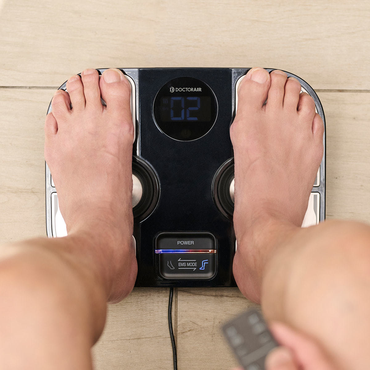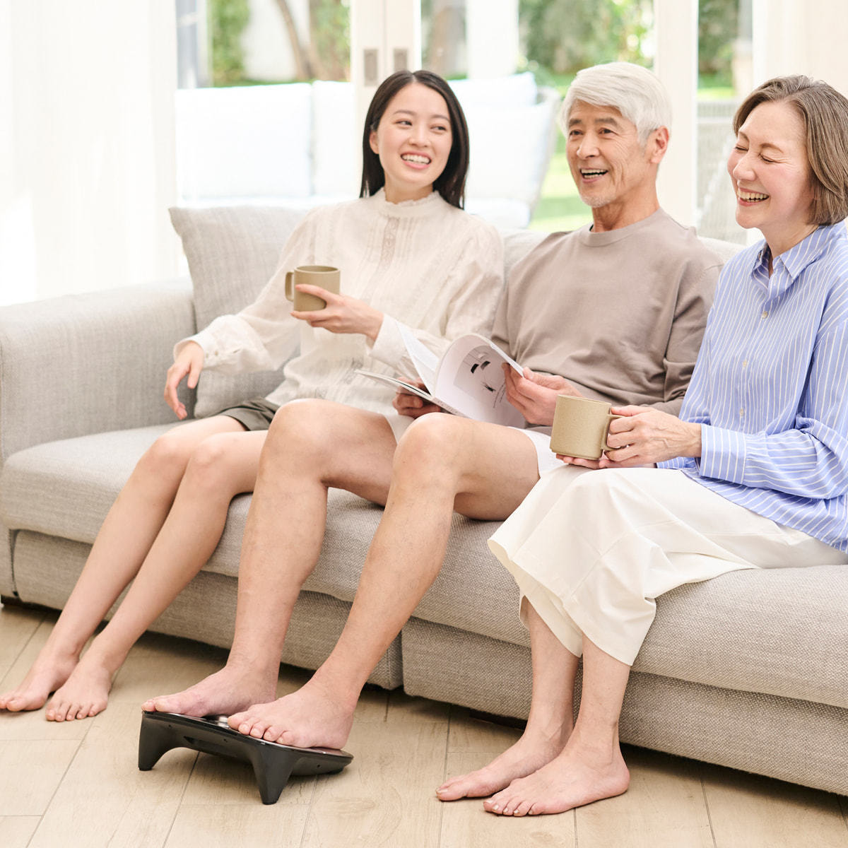 足の裏から微弱電流を流すことで脚の筋肉を動かす仕組みで、座ったままでも続けやすいトレーニングを実現します。