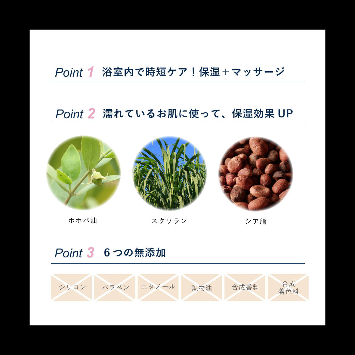 通常のボディミルクとは異なり、お風呂上がり直後のお肌に十分な水分が行き渡っているときに使用するため、保湿効果が高くなります。
