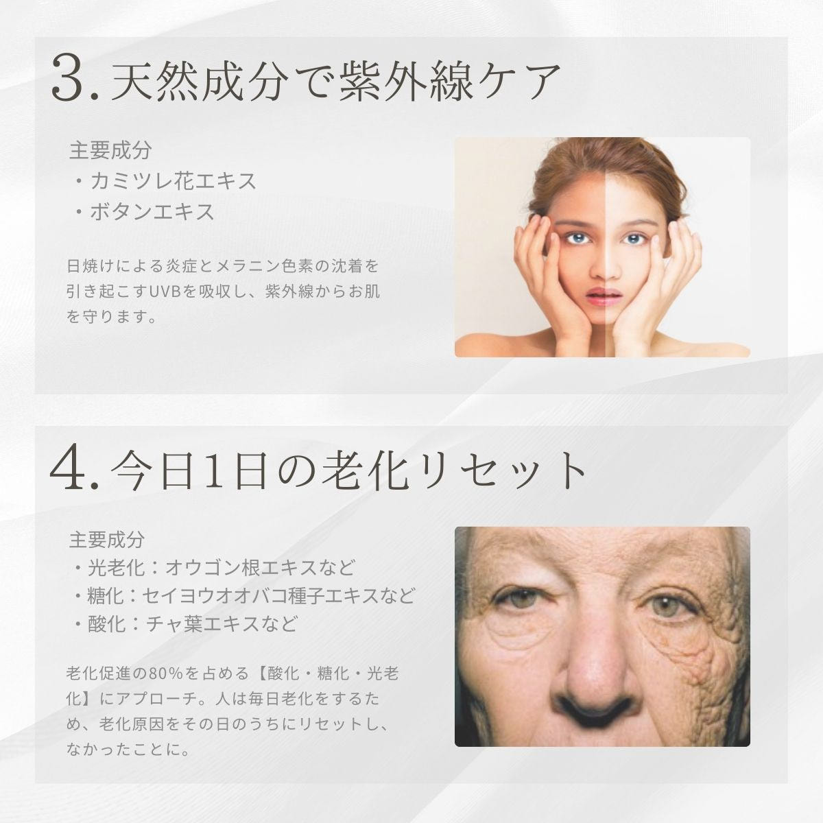 潤い不足やストレス、紫外線による肌老化にアプローチ。