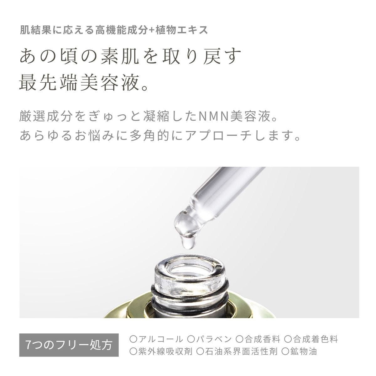 水、グリセリン、BG、ラウリン酸ポリグリセリル-10、ニコチンアミドモノヌクレオチド、ナイアシンアミド、カッパフィカスアルバレジエキス、カエサルピニアスピノサ果実エキス、レスベラトロール、乳酸桿菌、アスコルビン酸、カンゾウ根エキス、アラリアエスクレンタエキス、オレンジ果皮油、セージ油、リン脂質、水酸化K、ペンテト酸5Na、PEG-40水添ヒマシ油、ペンチレングリコール、1,2-ヘキサンジオール、PEG-20、トリ(カプリル酸/カプリン酸)グリセリル、カルボマー、PG、フェノキシエタノール