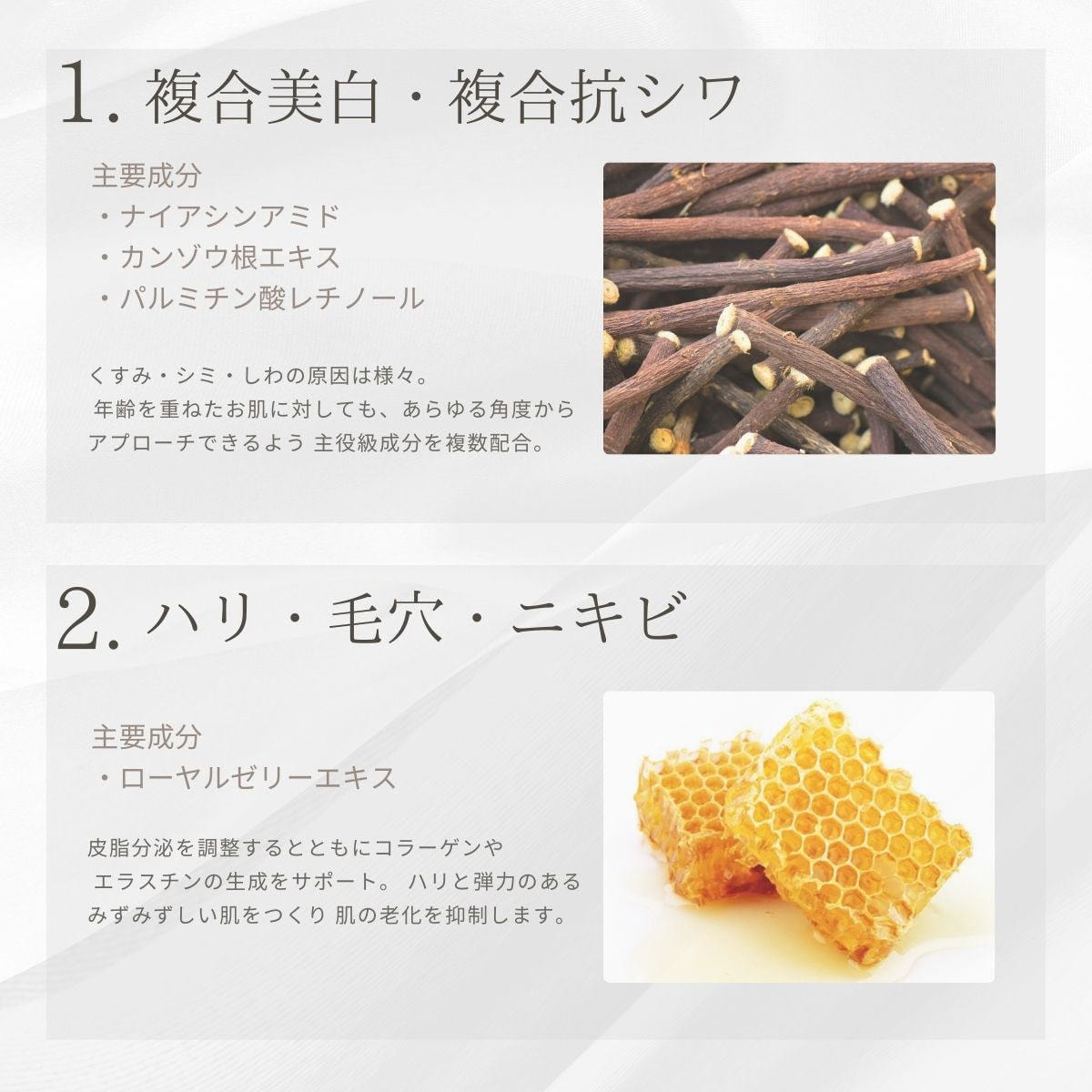 水、BG、グリセリン、ホホバ種子油、水添レシチン、ペンチレングリコール、ジグリセリン、トレハロース、ニコチンアミドモノヌクレオチド、ナイアシンアミド、パルミチン酸レチノール、加水分解シルク、ビフィズス菌培養溶解質、グリチルリチン酸2K、ローヤルゼリーエキス、カエサルピニアスピノサ果実エキス、カッパフィカスアルバレジエキス、カンゾウ根エキス、オウゴン根エキス、ハトムギ種子エキス、レモン果実エキス、ヒバマタエキス、ローズマリー葉エキス、マグワ根皮エキス、ダイズ種子エキス、レイシ子実体エキス、ウコン根茎エキス、ハマメリス葉エキス、セイヨウオオバコ種子エキス、アーチチョーク葉エキス、トコフェロール、ダイズ油、コーン油、ラウリン酸ポリグリセリル-10、イソステアリン酸ソルビタン、(アクリル酸ヒドロキシエチル/アクリロイルジメチルタウリンNa)コポリマー、ポリソルベート60、ポリソルベート80、キサンタンガム、クエン酸、クエン酸Na、EDTA-2Na、メチルパラベン、クチナシ果実エキス、フェノキシエタノール、安息香酸Na